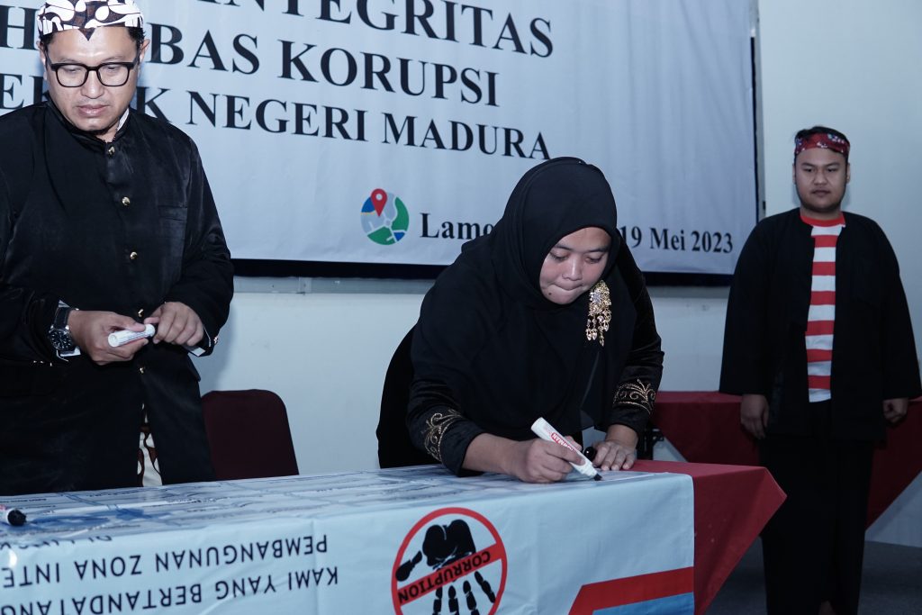 Dan acara ditutup dengan penandatanganan Pakta Integritas Tim ZI-Area manajemen perubahan. Dress code yang digunakan oleh seluruh peserta adalah baju sakera untuk peserta laki-laki dan baju Marlena untuk peserta perempuan. Acara ini diikuti oleh seluruh civitas akademika Politeknik Negeri Madura dan berlangsung dengan lancar pada hari pertama (Putri/Siska)